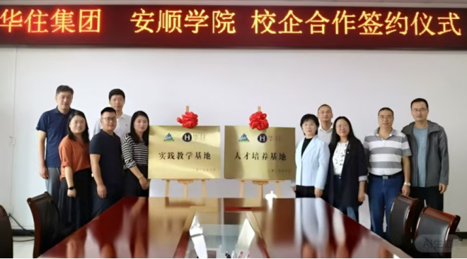 10月11日上午,安顺学院与华住集团在安顺学院安道楼会议室成功举行校企合作签约暨“实践教学基地”“人才培养基地”揭牌仪式,标志着双方在产教融合、人才共育领域深度合作正式启动。安顺学院副校长石恪,华住集团西南公司贵州省区运营官王苗苗及双方相关部门负责人出席仪式。