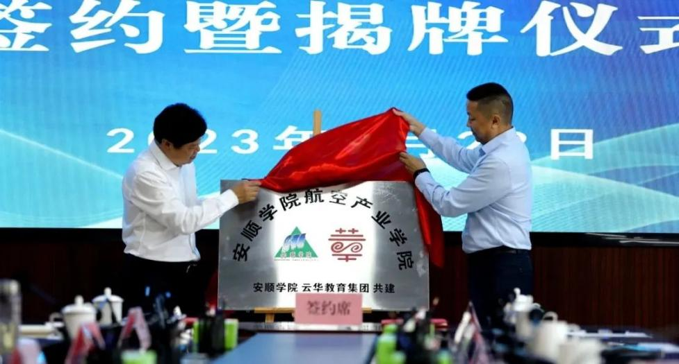 新国发2号文件提出,“支持贵州以装备制造及维修服务为重点的航空航天产业发展”。为把握贵州航空产业城建设历史机遇,加快融入贵州航空产业城建设,2023年9月22日,我校与云华教育集团共建航空产业学院签约暨揭牌仪式在安顺学院隆重举行。